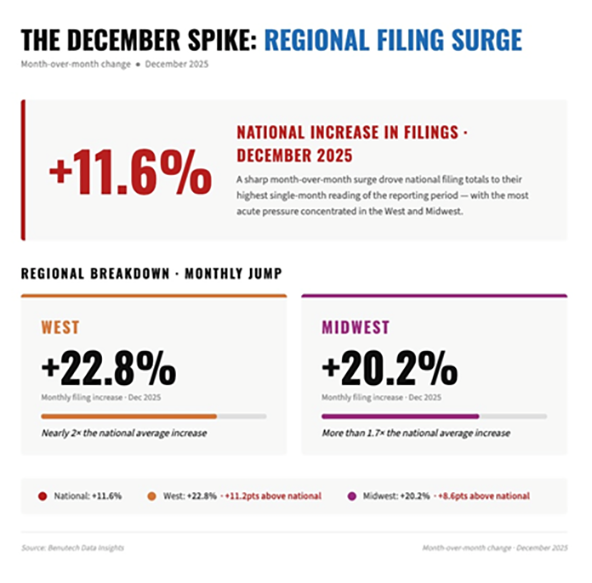 Perhaps most alarming for policymakers is the December spike. While the holiday season usually sees a lull in legal activity, December 2025 saw a sharp 11.6% national increase in filings. The surge was most pronounced in the West and Midwest, which saw monthly jumps of 22.8% and 20.2% respectively.