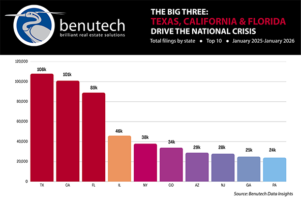 HUNTINGTON BEACH, Calif., March 12, 2026 — Through 2025, many headlines focused on the average American family grappling with the rising cost of living, including extensive housing affordability issues driven by stubbornly high interest rates and home prices. While these problems concern buying a home, current homeowners are facing their own quieter, more systemic pressure in the American housing market. New data released today from real estate data solutions provider Benutech reveals that between January 2025 and January 2026, the nation's mortgage servicers filed more than 808,000 foreclosure-related documents, signaling a year of growing volatility for American families.
